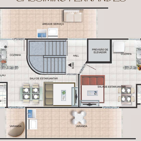 Residencial Cassimiro Fernandes possui um total de 8 apartamentos de dois quartos, sem suíte, distribuídos em uma torre de 4 andares com 2 apartamentos por andar, banho social, sala para dois ambientes, cozinha americana e área de serviço.