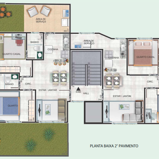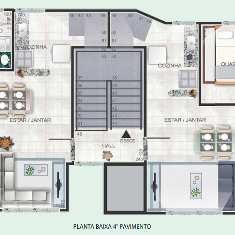 O Residencial Narciso possui um total de 7apartamentos de dois quartos, 1 suíte, distribuídos em uma torre de 4 andares com o primeiro andar com 1 apartamento e os outros 3 andares com 2 apartamentos por andar, banheiro social, sala para dois ambientes, cozinha americana e área de serviço.
